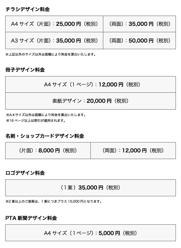 - 上記の料金はデザイン料のみです。原稿作成、コピーライティング、写真撮影、マップ作成は含まれません。(簡単な写真撮影、マップ作成は別途料金で承ります。)